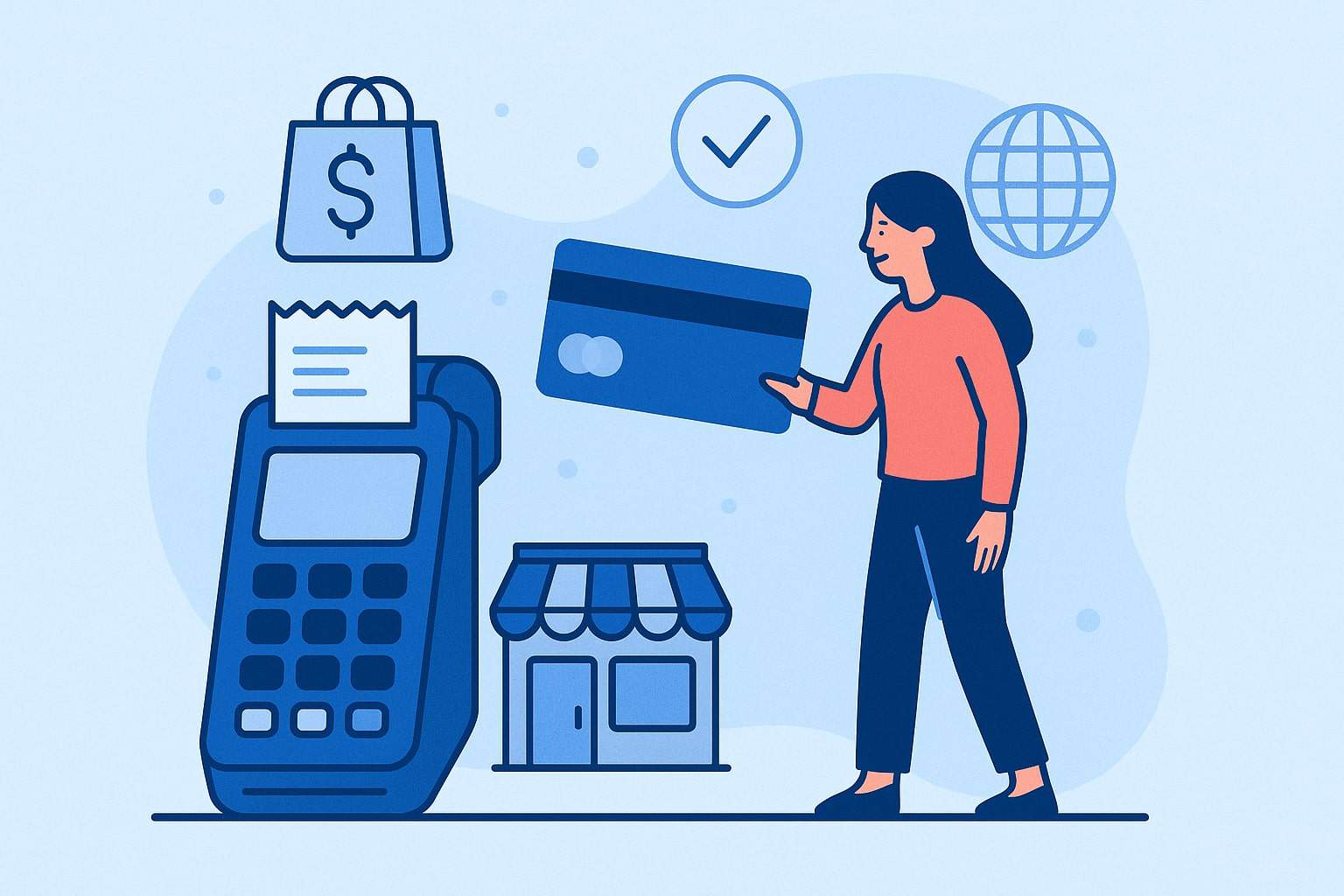 gives an example of a retail POS setup: a touchscreen register, an internet-connected terminal, a cash drawer, and a printer. Many businesses use integrated POS devices (like Square Stand or Clover) that include a card reader. Mobile vendors can use smartphone-based readers. Regardless of setup, the payment still flows through the same merchant services network.